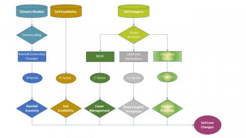 Στο προτεινόμενο, «προσαρμοσμένο» μοντέλο εδαφικής απώλειας, ο παράγων R παραμετροποιείται και υπολογίζεται με βάση τη μελλοντική ένταση/διαβρωτικότητα της βροχόπτωσης αξιοποιώντας κλιματικά μοντέλα και διαδικασίες αναγωγής σε τοπική κλίμακα∙ ο παράγοντας K αποκτάται από σχετικές βάσεις δεδομένων∙ οι δε παράγοντες C, LS και P προκύπτουν από την επεξεργασία και ανάλυση υφιστάμενων δορυφορικών εικόνων, ΨΜΕ (Ψηφιακών Μοντέλων Εδάφους), και ταξινομητικών σχημάτων χρήσης/κάλυψης εδάφους (CORINE Land Cover (CLC)), αντίστοιχα (Διάγραμμα 1)∙ εναλλακτικά, οι παράγοντες C, LS και P προκύπτουν στη βάση της επεξεργασίας και ανάλυσης λήψεων (δηλαδή πολυφασματικών εικόνων) από UAVs (Διάγραμμα 2).